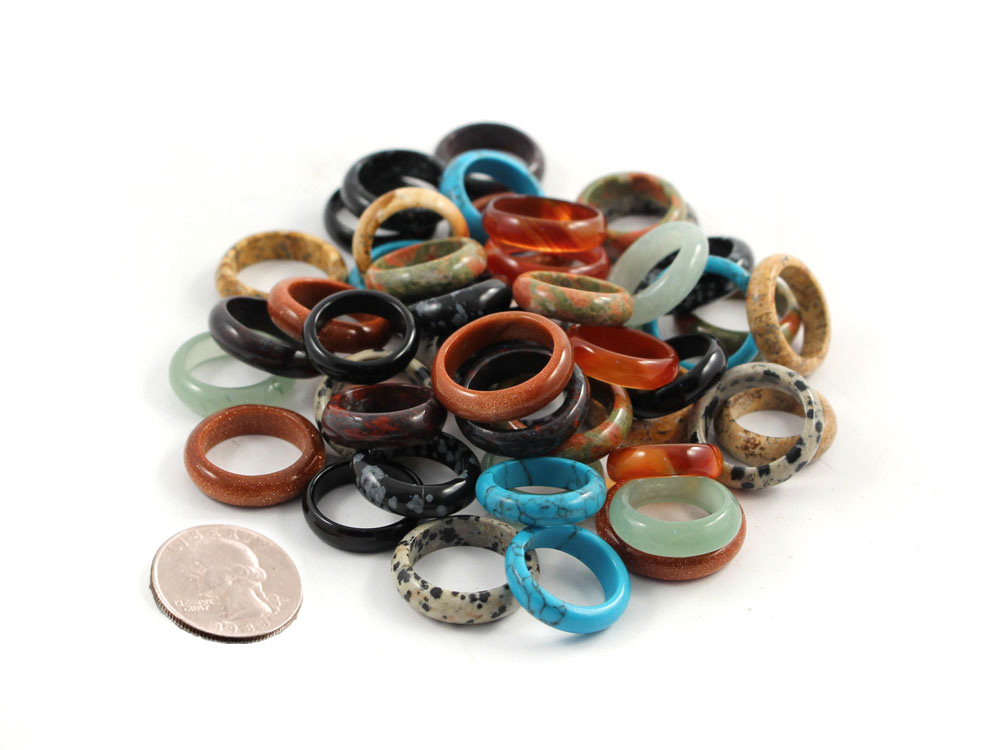 This set consists of 50 gemstone rings in different sizes and gemstone varieties. The gemstones include jade/serpentinite, turquoise (stabilized), snowflake obsidian, dalmatian stone, unakite, goldstone and carnelian, with a few others mixed in.